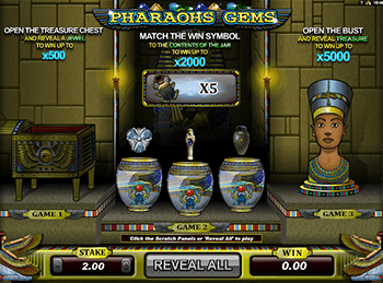 Pharaohs Gems – это лотерея со скретч-картами, где вы можете получить моментальный выигрыш до $50 000. Игровой процесс выглядит очень необычно, но тем не менее проходит по стандартному сюжету. Перед вами – всего три игры, в каждой из которых можно заработать солидный приз. Лотерейный билет приобретается вначале раунда за сумму от 0,5 до 10 долларов. Все выплаты распределяются случайным образом после покупки карточки (алгоритм ГСЧ). В игре нет бонусных опций, специальных знаков, рисковых туров и прочих дополнительных функций.